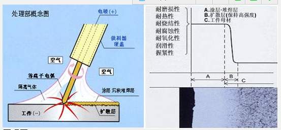 圖1所示的是(堆焊,涂層)的示意圖及各種特性。A區(qū)是堆焊到工件表面的涂層或堆焊層,由于與母材之間產(chǎn)生了合金化作用,向工件內(nèi)部擴散,熔滲,形成了擴散層B,得到了高強度的結(jié)合.